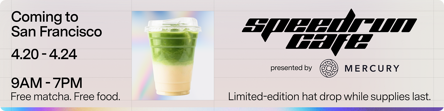 Join us at the pop-up speedrun cafe (presented by Mercury) in SF during the first week of the SR007 application window: April 20th–24th! Each guest can snag a drink, a food item, and a limited-edition hat (while supplies last).