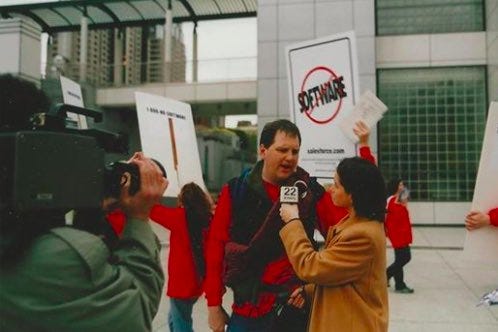 Benioff had hired 25 actors, dressed them in bright red t-shirts emblazoned with “death to software,” and had them march with signs shouting slogans like “Red rover, red rover, software is over.” He even hired a fake news network called “Channel 22” to show up in a news truck and interview the protesters like it was a real political movement.