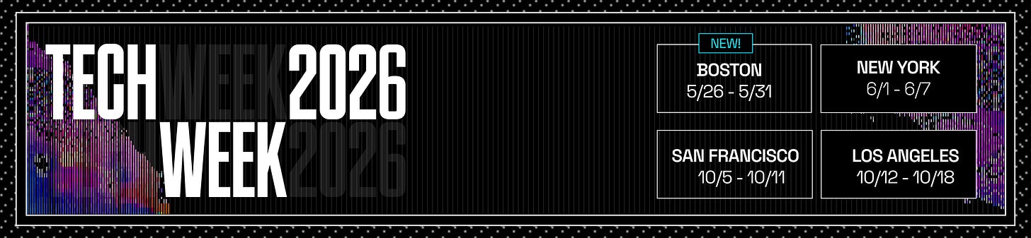 The founder-favorite series is back next year: kicking off with Boston’s first Tech Week, May 26–31, and then heading to New York, June 1–7, before wrapping up on the West Coast with San Francisco and Los Angeles in October.