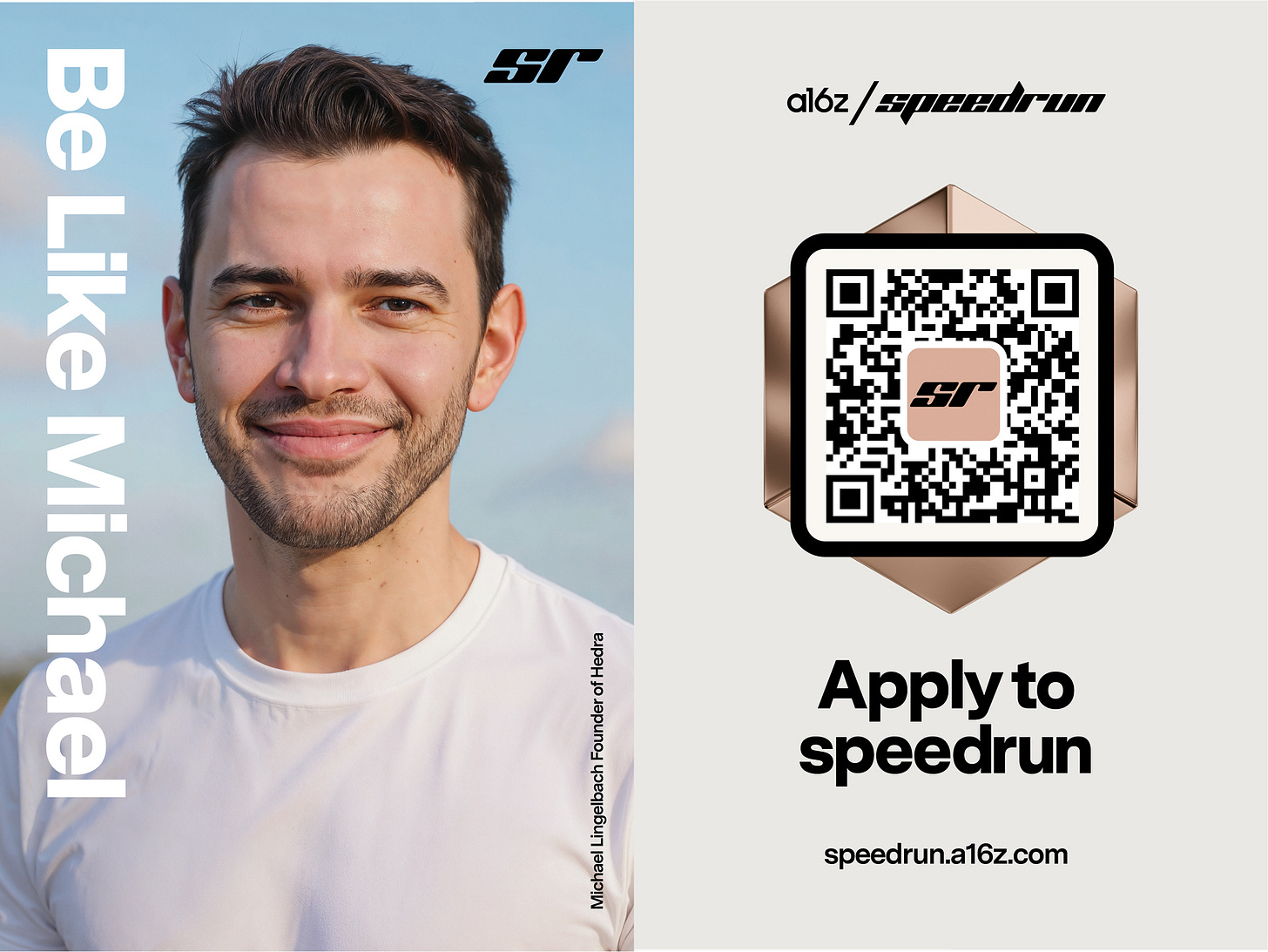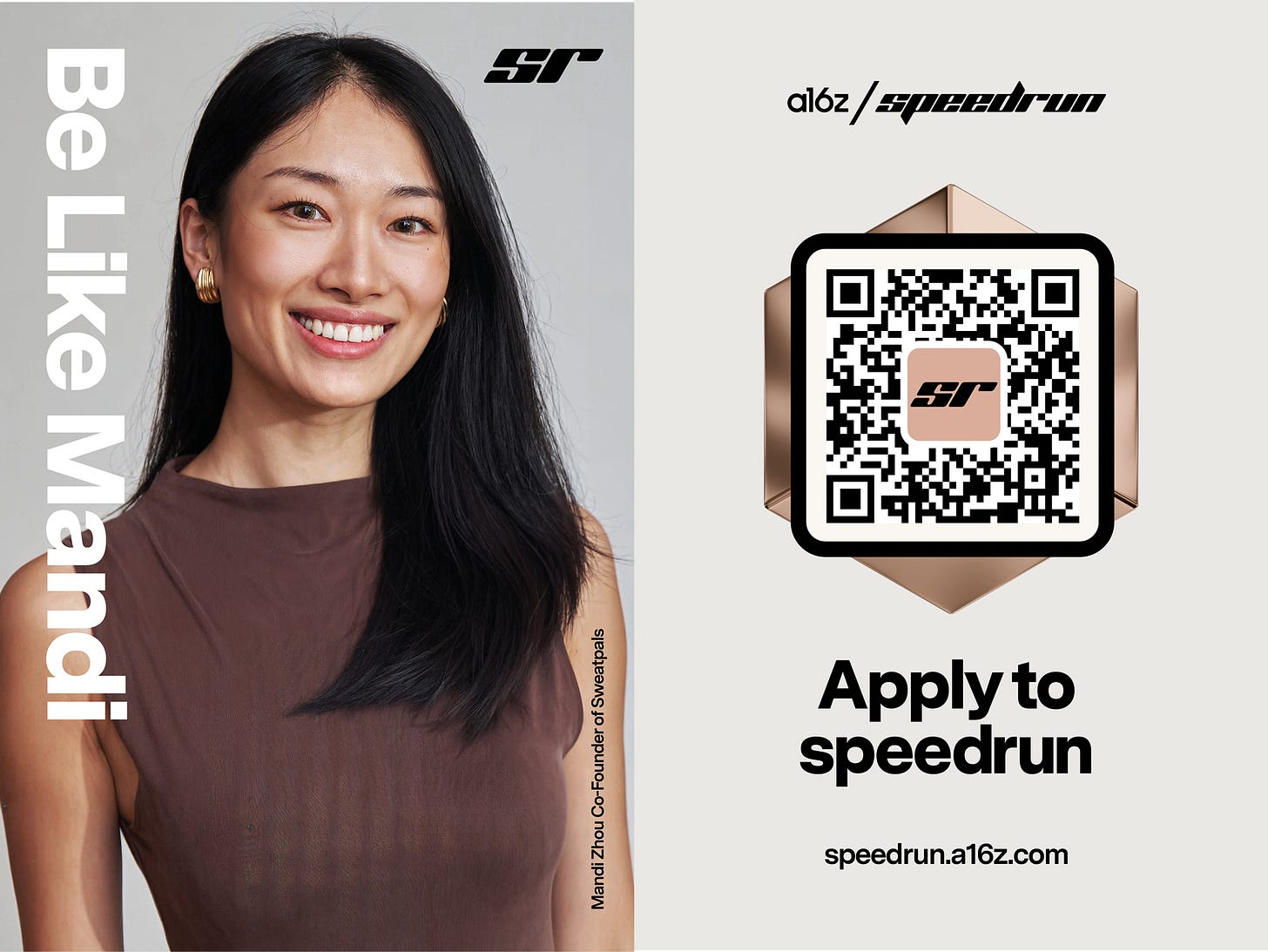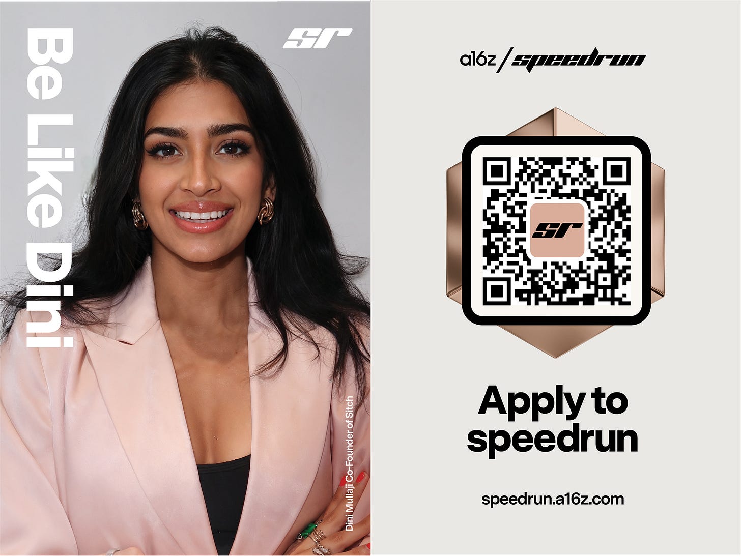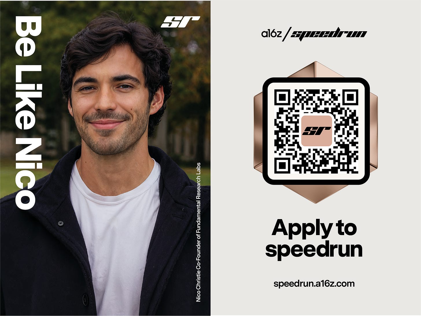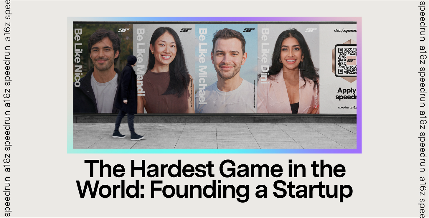 Echoing a famous ad campaign from decades past, the posters feature a call to “be like” four a16z speedrun alumni: Fundamental Research Labs’s Nico Christie, SweatPals’s Mandi Zhou, Hedra’s Michael Lingelbach, and Sitch’s Nandini Mullaji, each of whom has gone on to raise millions after graduating from SR.